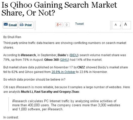 两个相差极大的数据中,哪一个才更值得采信呢?对此,花旗集团分析师发布研究报告称,就奇虎360搜索份额而言,艾瑞咨询(iResearch)的数据比国内权威流量统计机构CNZZ更靠谱。